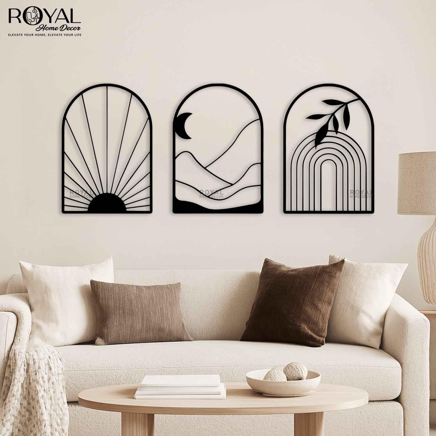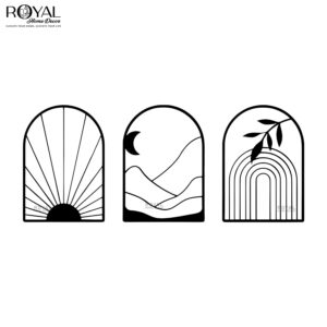 Transform your living space with the timeless elegance of Arcadian Bliss. This stunning set of three minimalist metal wall art pieces seamlessly blends modern design with nature-inspired aesthetics, creating a serene and captivating atmosphere. Each piece, measuring 15×10 inches, features unique geometric patterns with arched silhouettes that symbolize dawn, dusk, and harmony with nature.