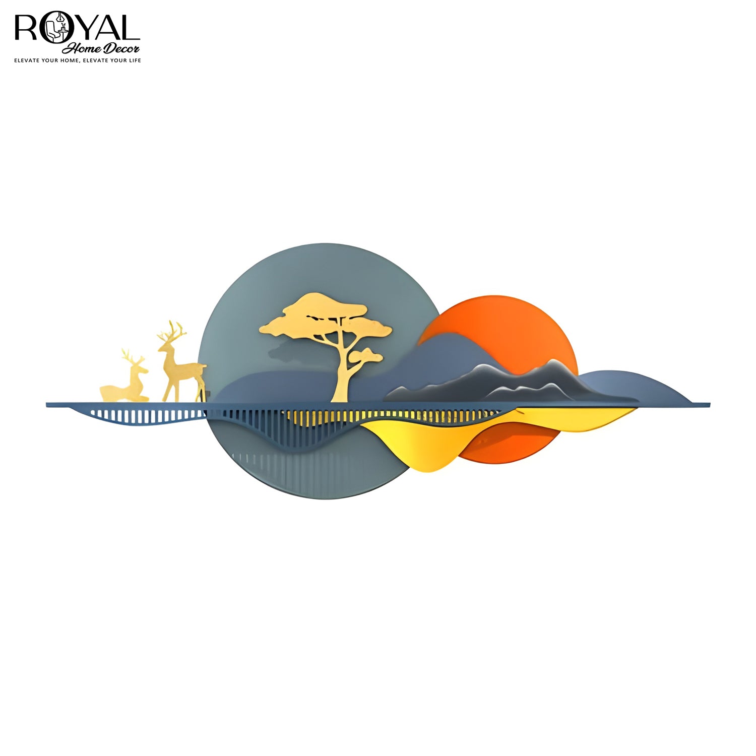 Transform your living space with the breathtaking elegance of our Sunset Serenity Metal Art. This stunning wall decor piece captures the essence of a serene sunset with its intricate metal craftsmanship and vibrant hues. Featuring majestic mountains, graceful deer, and a solitary tree against the backdrop of a radiant sun, this piece brings the beauty of nature indoors.
